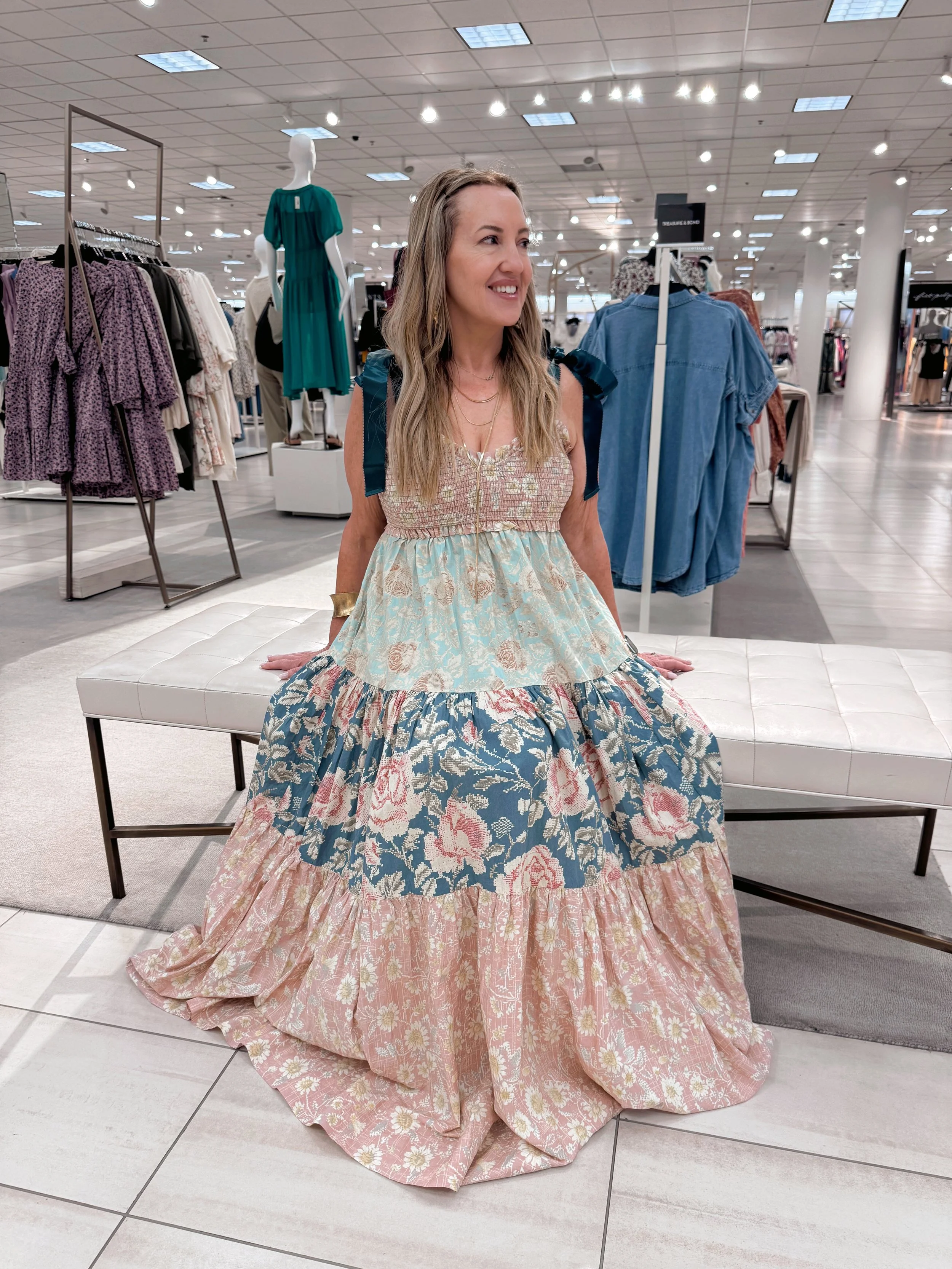 In true San Antonio style, it’s about the mix. Picture a tropical twist-front crop top paired with a tiered crochet lace maxi skirt and platform espadrilles—boho meets street chic with a nod to the Majestic marquee and King William charm. Or a breezy cream maxi scattered with oversized floral embroidery, made for Southtown art walks and Fiesta picnics. There’s also the luxe side: a silky, strapless maxi bursting with bold, Fiesta-worthy swirls of turquoise, pink, and citrus, or a retro caramel-hued geometric print dress with shoulder ties—perfect for day-to-night party hopping.